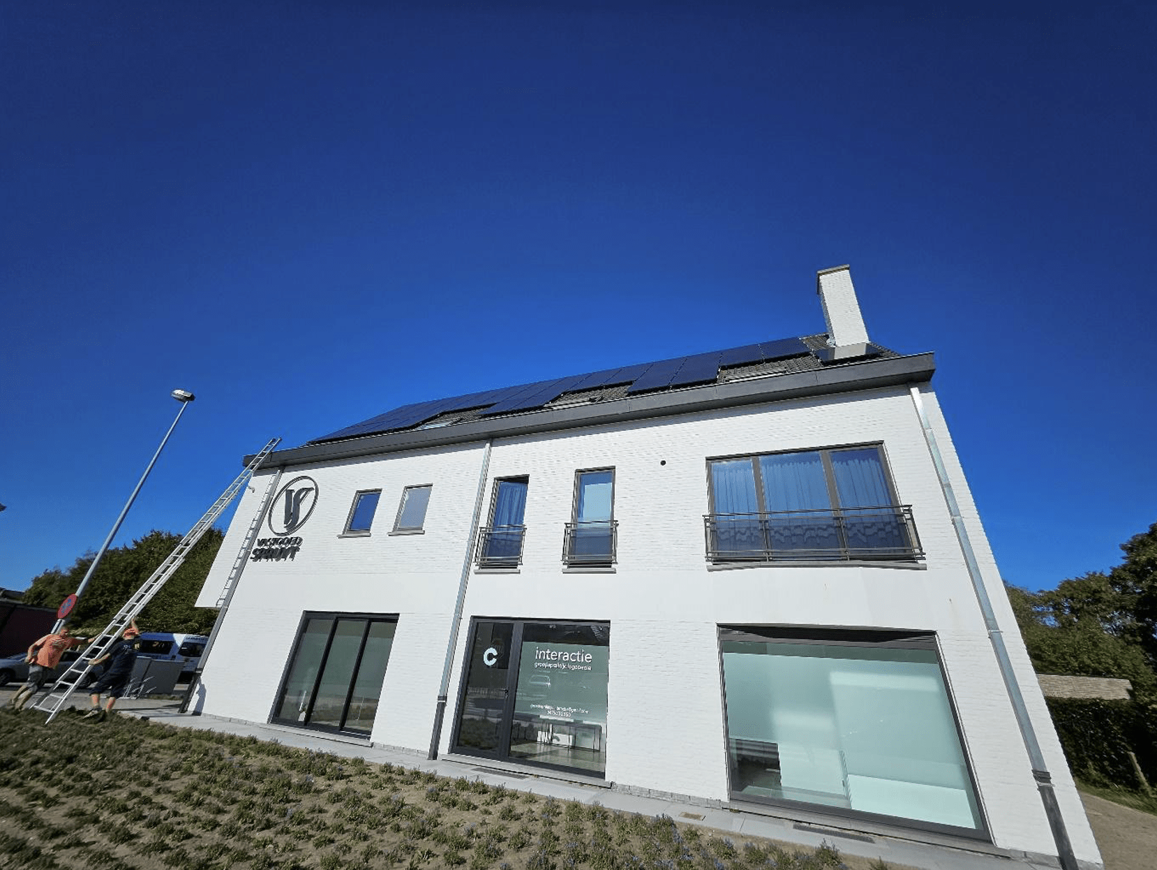 72 zonnepanelen leveren heel wat energie op. Meer dan wat het vastgoedkantoor alleen zou kunnen opsouperen. Je kunt in dat geval kiezen voor de installatie van eenthuisbatterij of om aan energiedelen te doen. Dit vastgoedkantoor in Merelbeke koos voor de laatste optie.